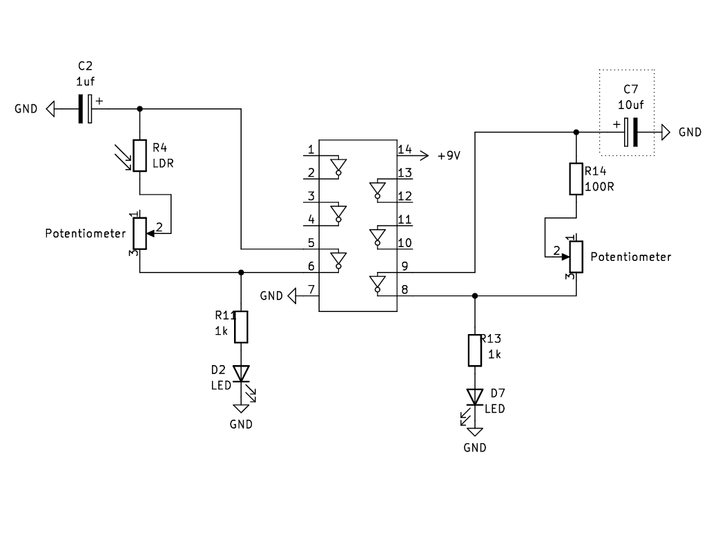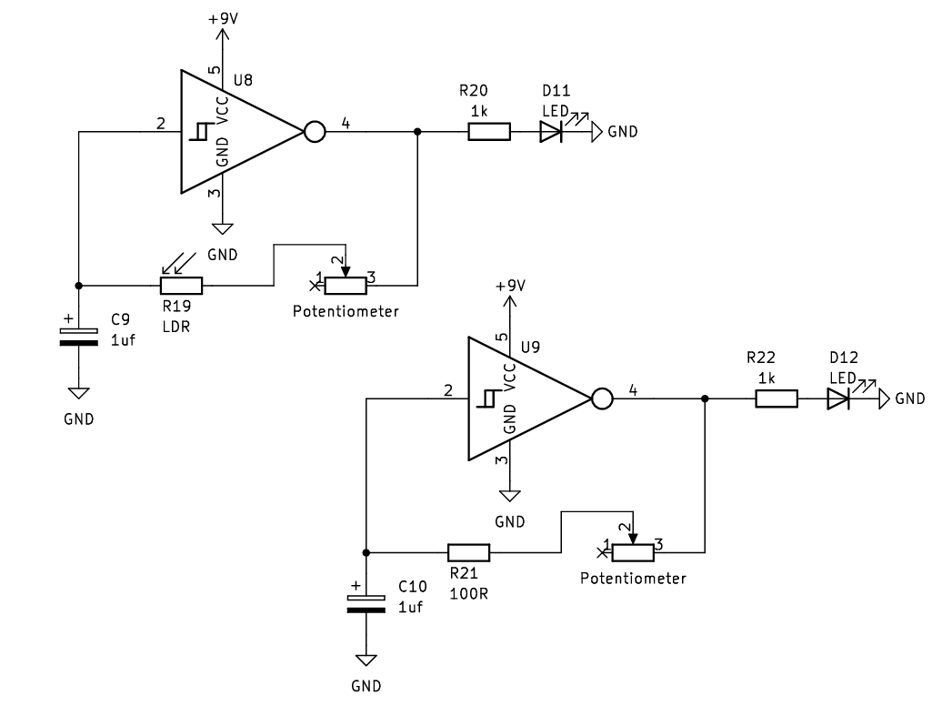 Remember that our first oscillator can be controlled by light via the LDR, and both oscillators have LEDs on their outputs, so if we face the LED of the second oscillator into the LDR of the first one, the frequency of the first oscillator will be modulated by the output of the second one.