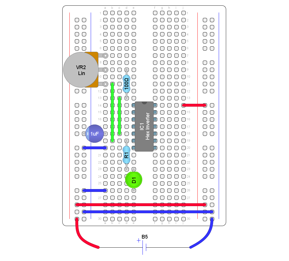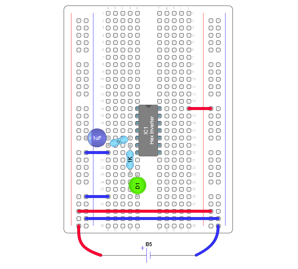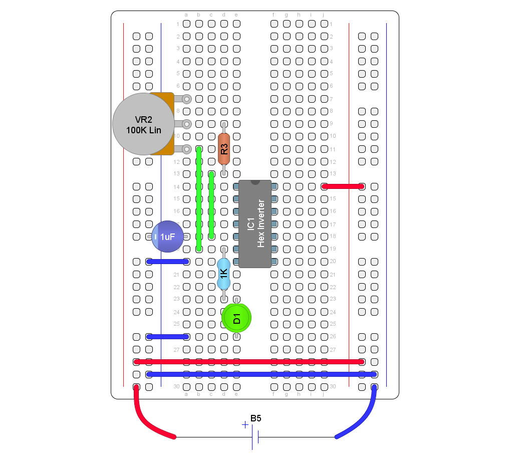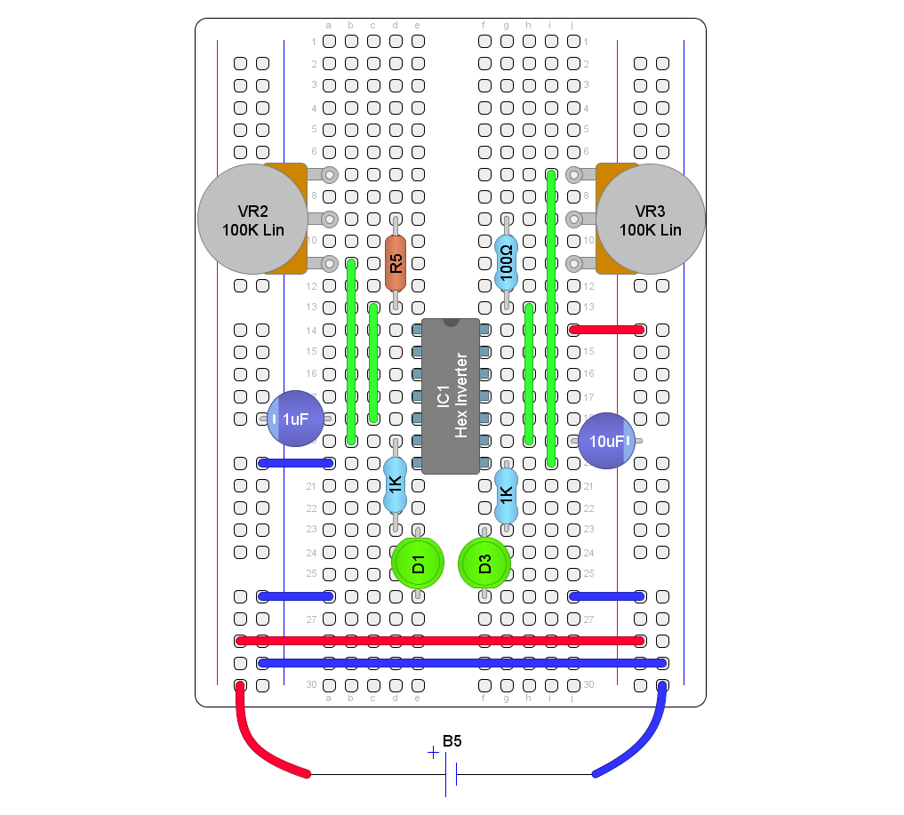 Now we want to make a second oscillator. Remembering that the IC that we are using is a hex invertor, which means it has six invertors, we can simply make the same circuit again using one of the other invertors on the chip.