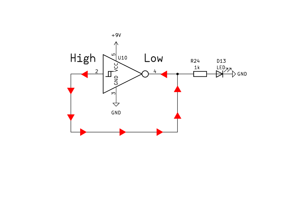 So if we were to connect the invertor’s output back to its input, it would oscillate very fast from low to high as the output will change the input, which will in turn change the output etc. This is called a feedback loop.