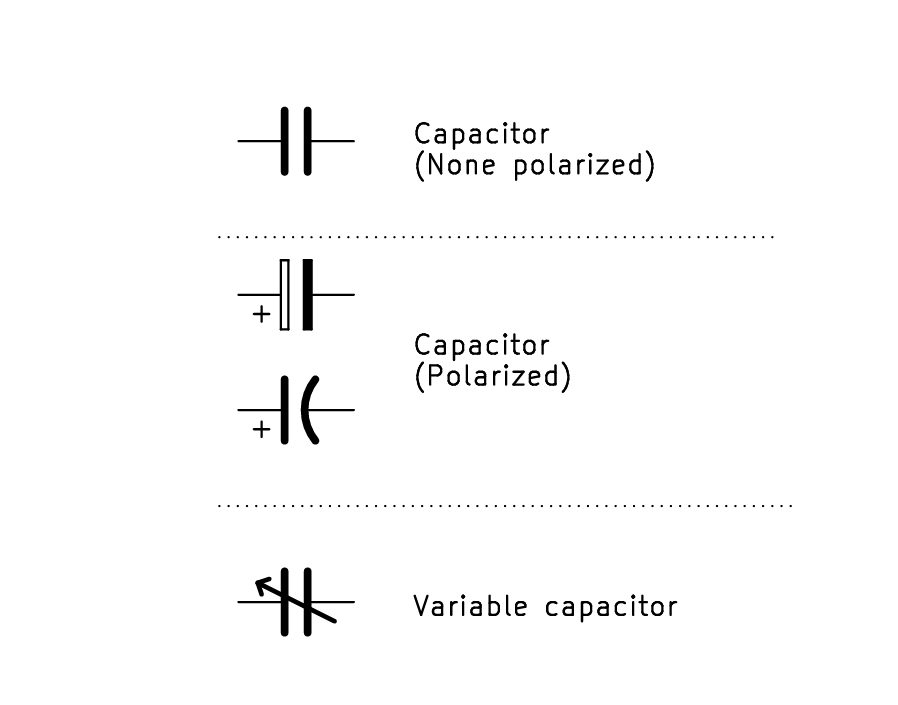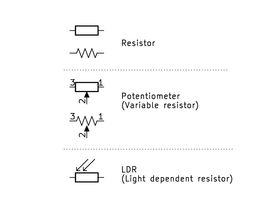 Here are some symbols for different types of resistors. For each component there are often various symbols that can be used. Resistors are on where you will often see either the block symbol, or squiggly line symbol. Both are the same.
